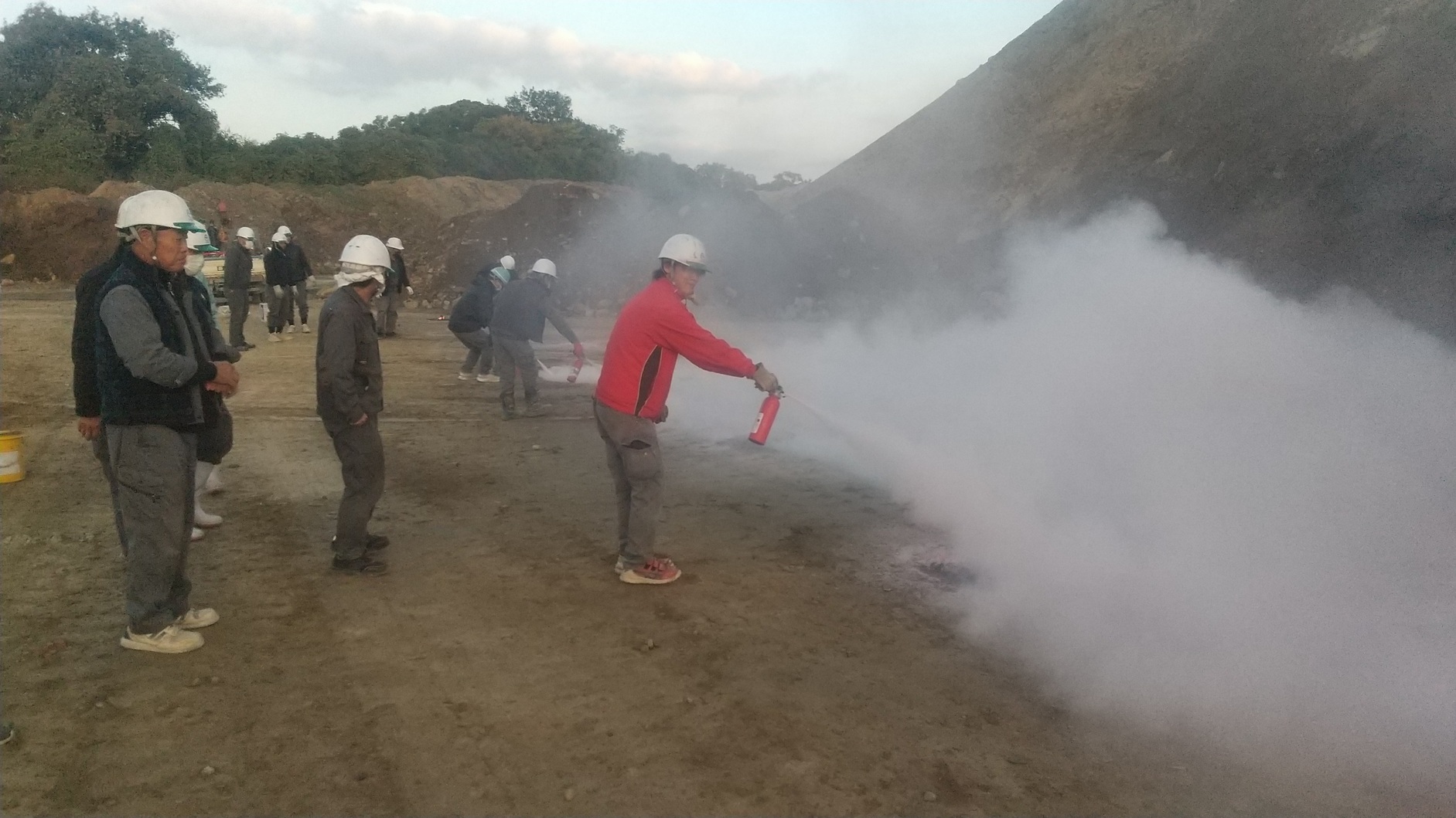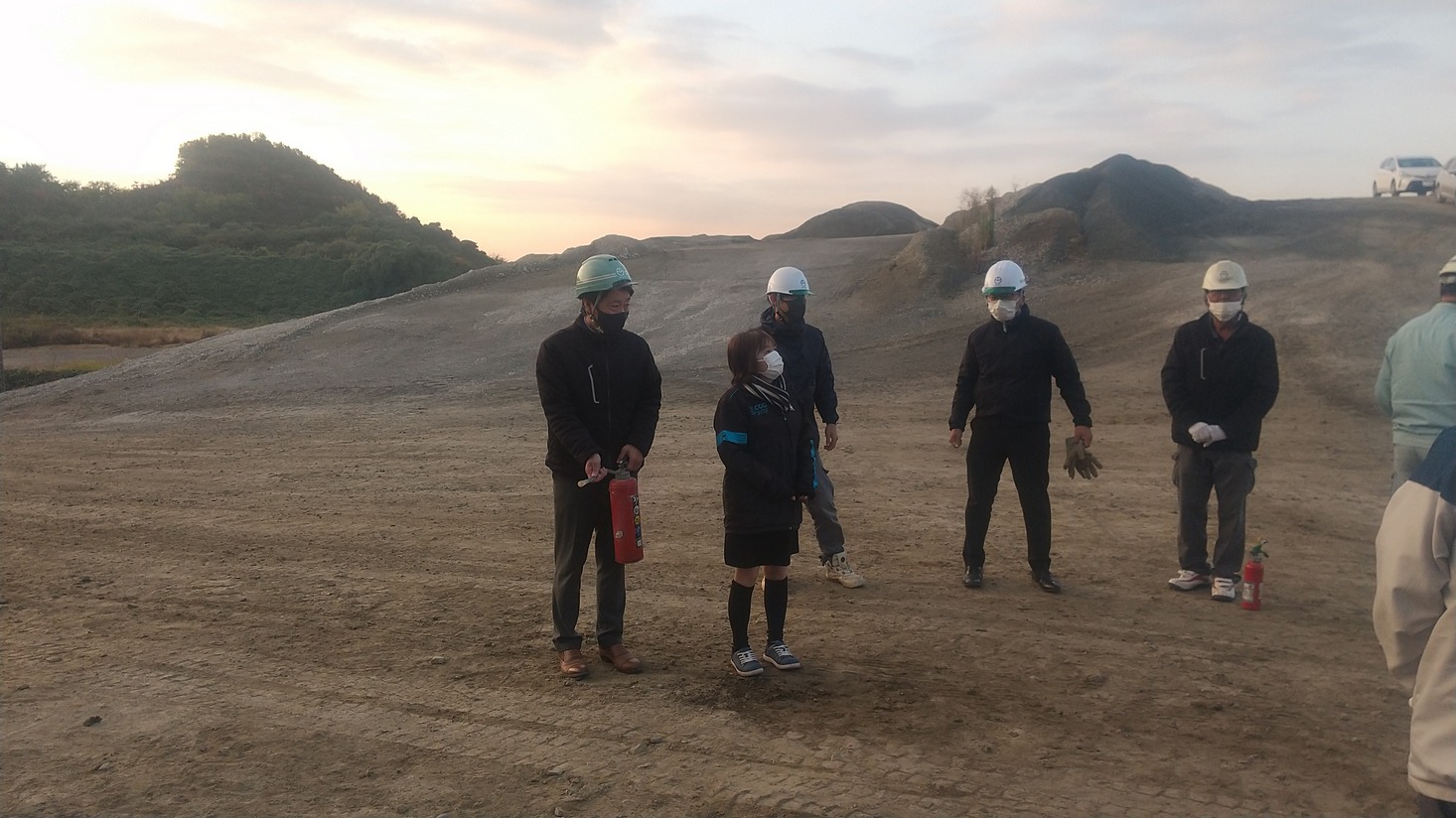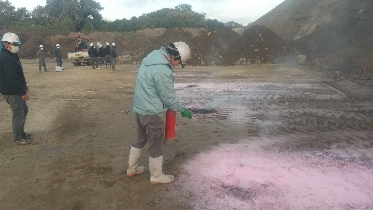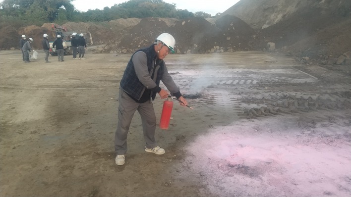 令和7年11月15日、大門砕石場にて第4回防災訓練を実施しました。今回の防災訓練の目的は、火災発生による消火器の使用と、ガス漏れ発生による救護訓練の2通りです。まず従業員を半数に分け、消火訓練は屋外、救護訓練は屋内で同時刻に訓練を開始。