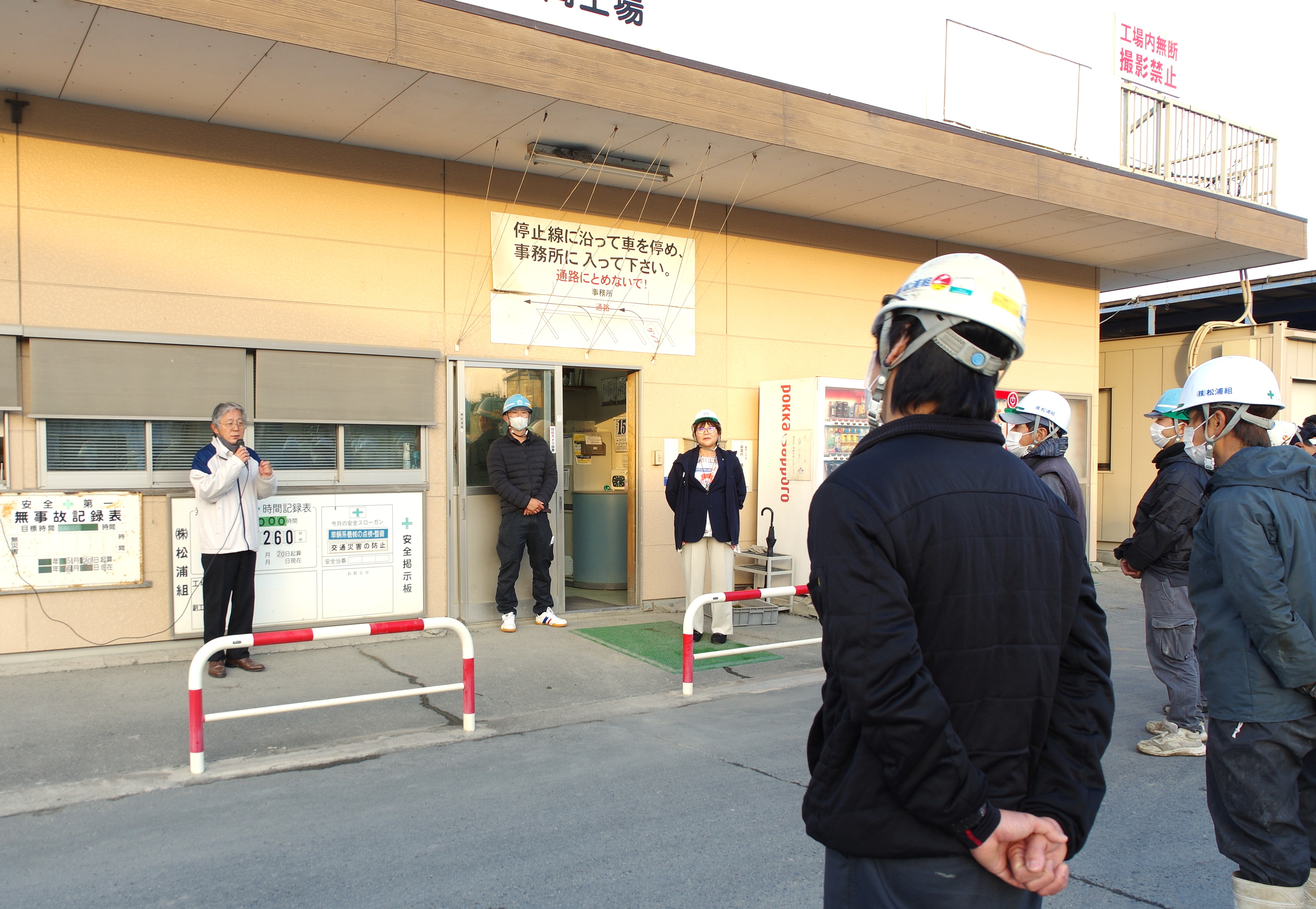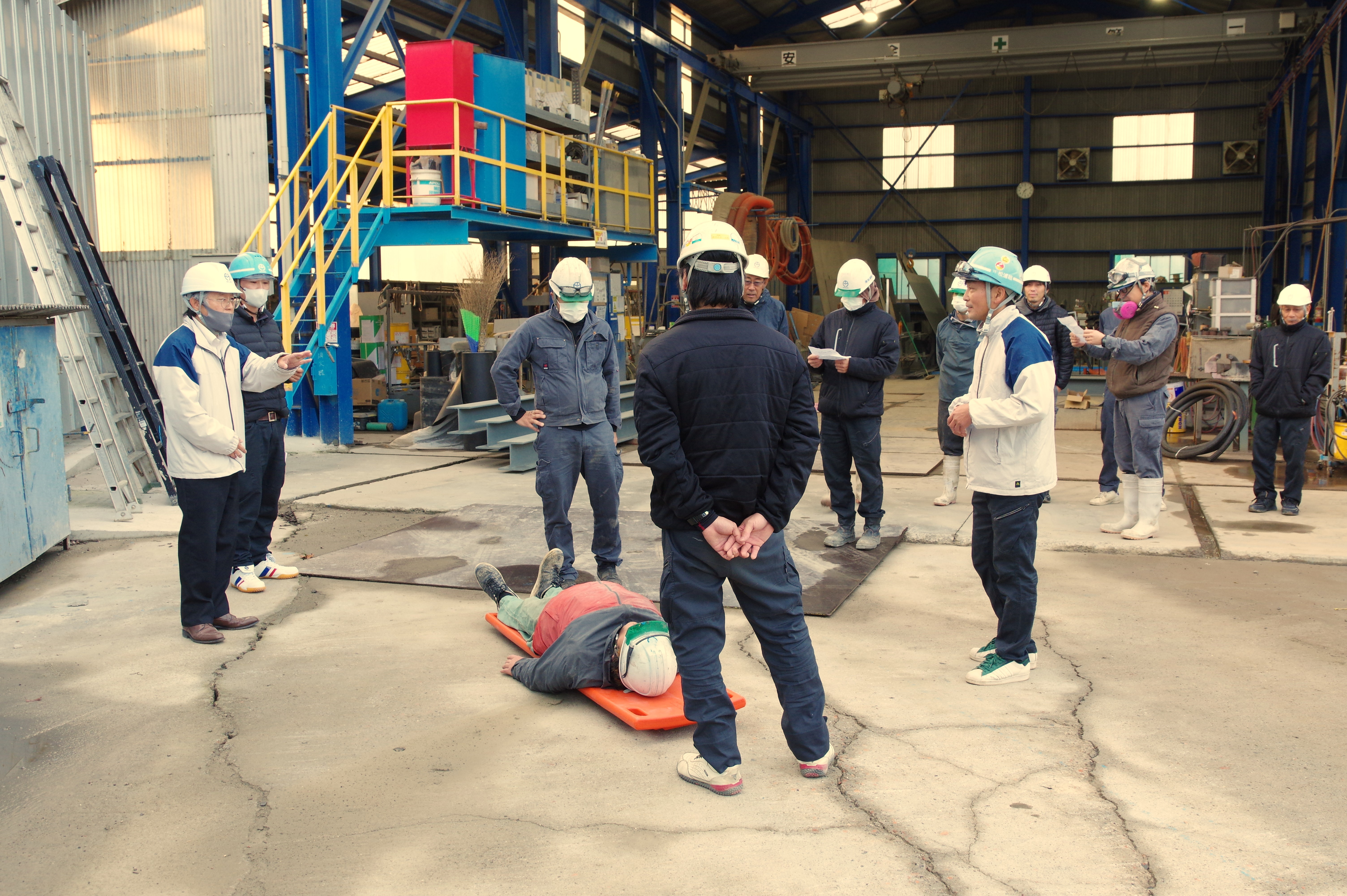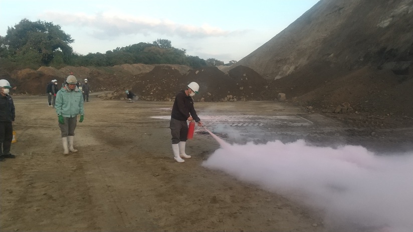 令和7年11月15日、大門砕石場にて第4回防災訓練を実施しました。今回の防災訓練の目的は、火災発生による消火器の使用と、ガス漏れ発生による救護訓練の2通りです。まず従業員を半数に分け、消火訓練は屋外、救護訓練は屋内で同時刻に訓練を開始。