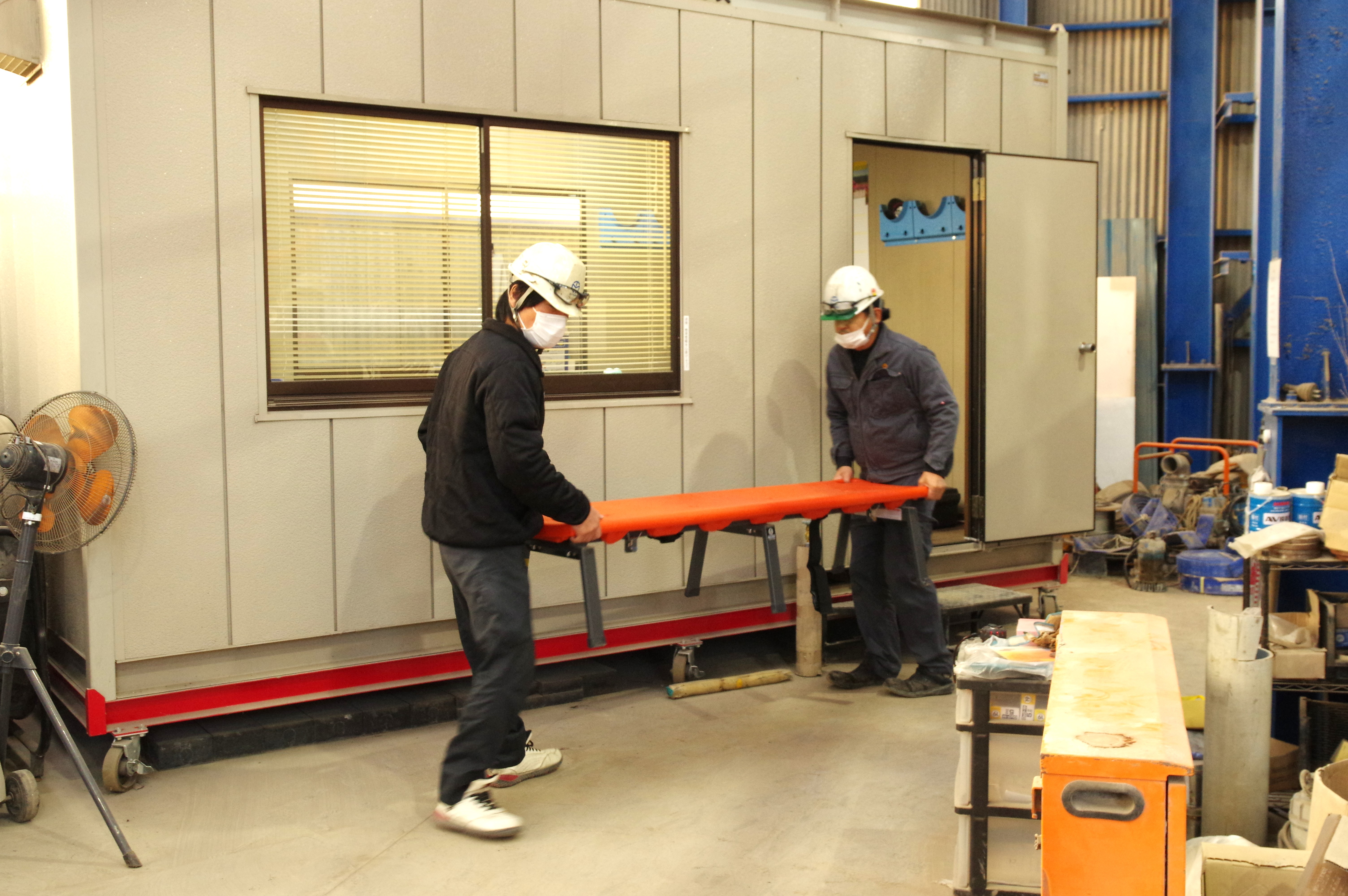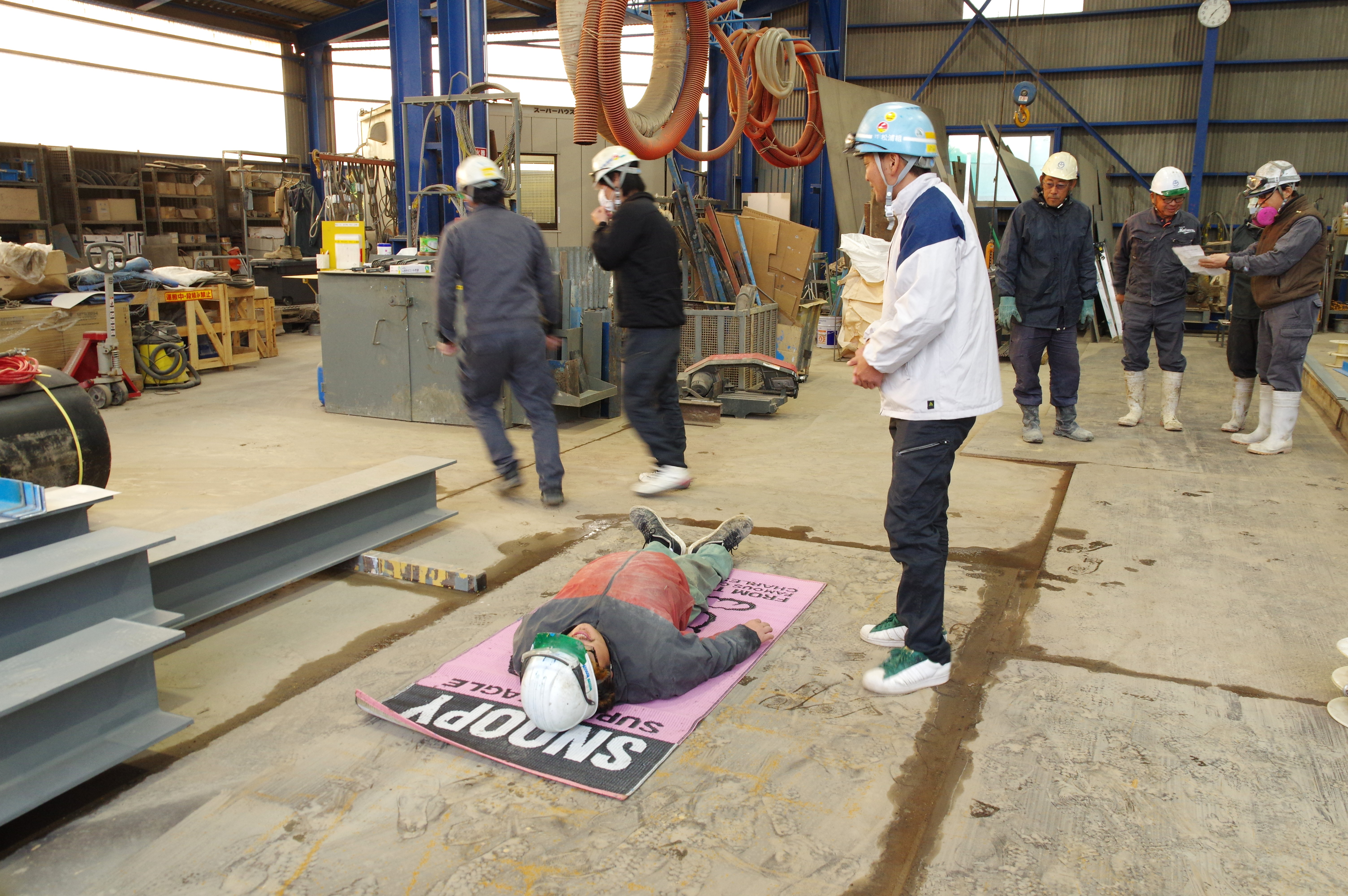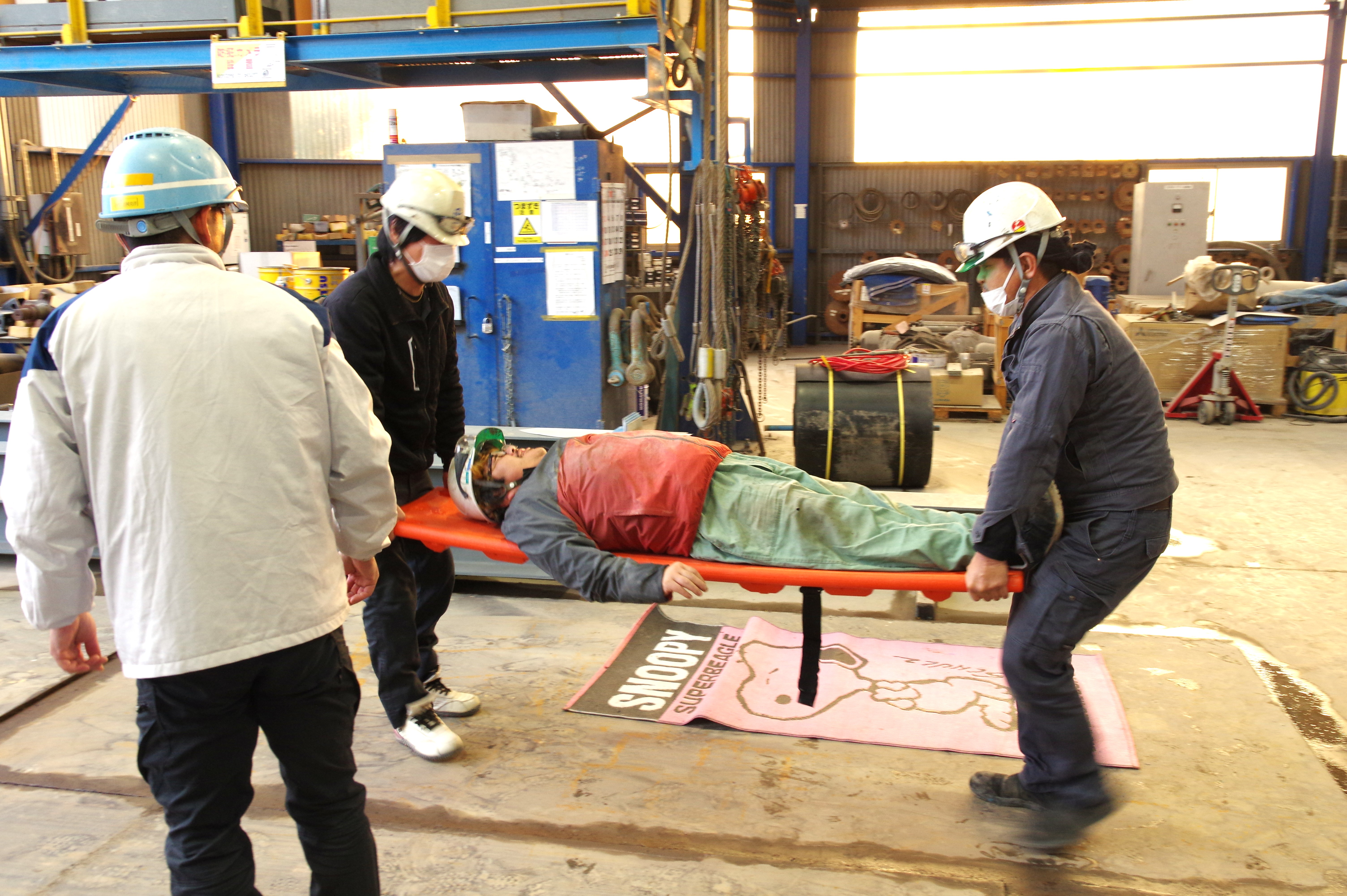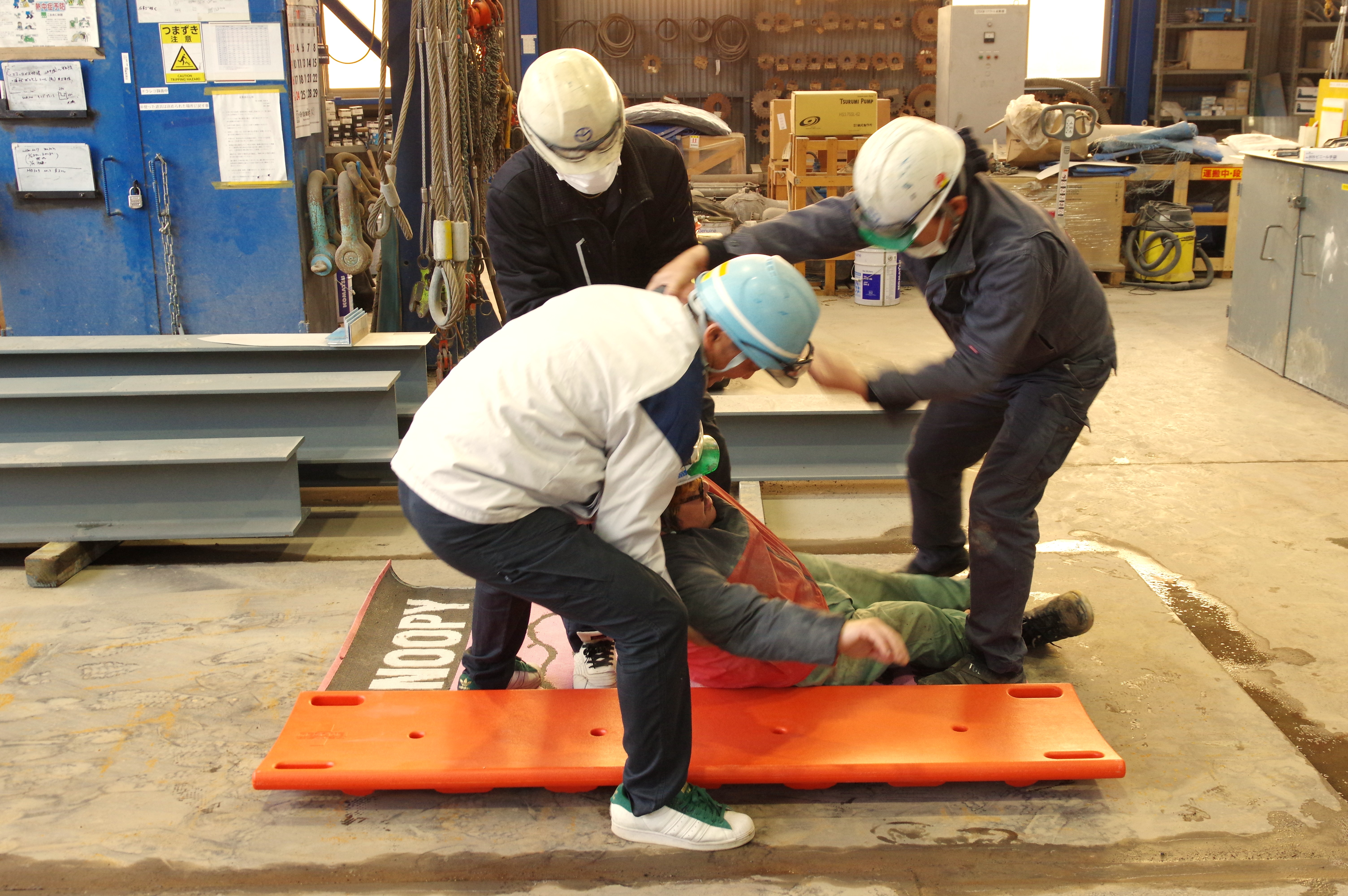 屋内での救護訓練は、1人が要救助者役を担い、その人に対し、1人が声掛けをし、もう2人が担架に乗せて建物の外へ運ぶまでを1セットとして、全員が参加するまで繰り返し実施しました。